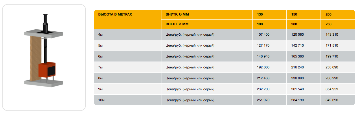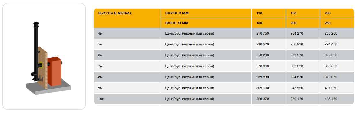 Внешняя оболочка выполнена из оцинкованной стали толщиной 0,6 мм, которая окрашена в чёрный цвет специальным порошковым покрытием. Данный состав защищает трубу от воздействия атмосферных осадков и придает дымоходу уникальный темный оттенок и благородный вид.