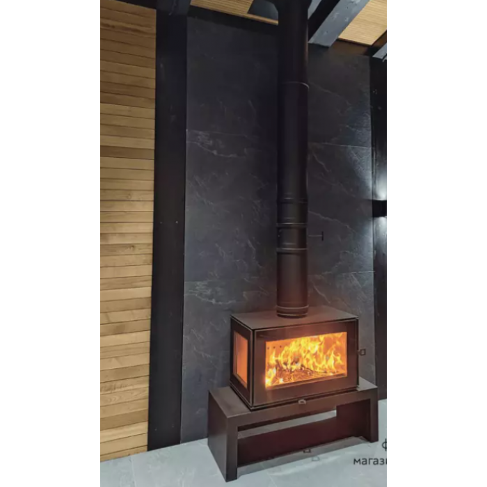Печь-камин КУБ 3С 800 сочетает в себе эстетику, функциональность и экологичность. Её минималистичный корпус из стали, окрашенной в черный цвет, придает ей элегантный и современный вид.